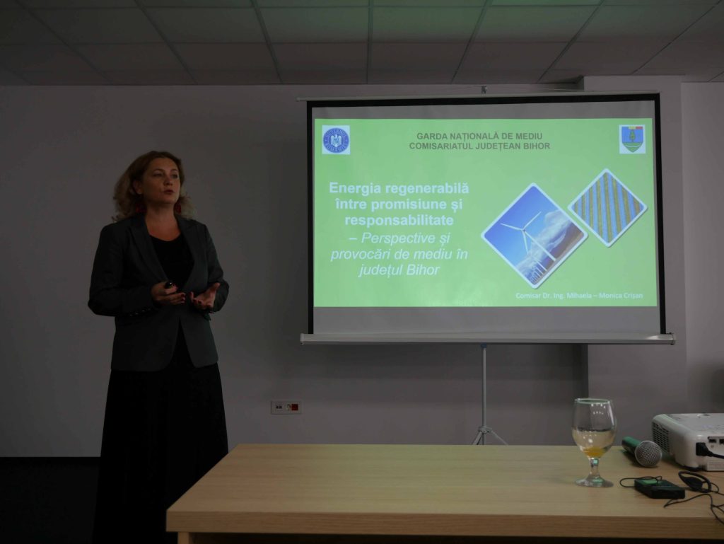 Monica Crișan, comisar la Garda Națională de Mediu Bihor și membru activ în cadrul IMPEL (Rețeaua Uniunii Europene pentru aplicarea și respectarea legislației de mediu), a vorbit despre transpunerea directivelor europene în legislația românească, în special despre ținta de reducere a emisiilor de gaze cu efect de seră.